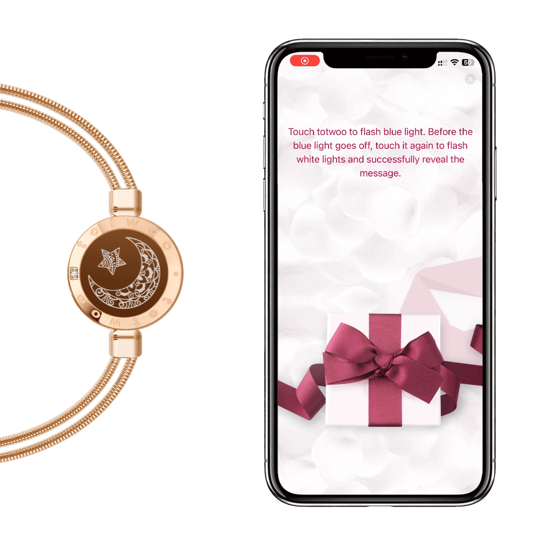 Las pulseras Totwoo crean un espacio íntimo y privado para ti y tu pareja. Las luces y los recordatorios no solo los ayudarán a sentirse conectados, sino que también tendrán un lugar para expresar su amor con fotos, videos, audio y mensajes de texto en la app Totwoo. Cuando tu pareja toque la joya, aparecerá un mensaje sorpresa acompañado de la vibración y la luz. Incluso puedes chatear con tu ser querido en la app Totwoo.